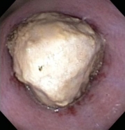 Esophagoscopy was performed, and a 5-6 cm mass of foreign material was identified with extensive esophageal wall necrosis. Owners found he had been chewing on drywall joint compound. The dog was euthanized due to poor prognosis.