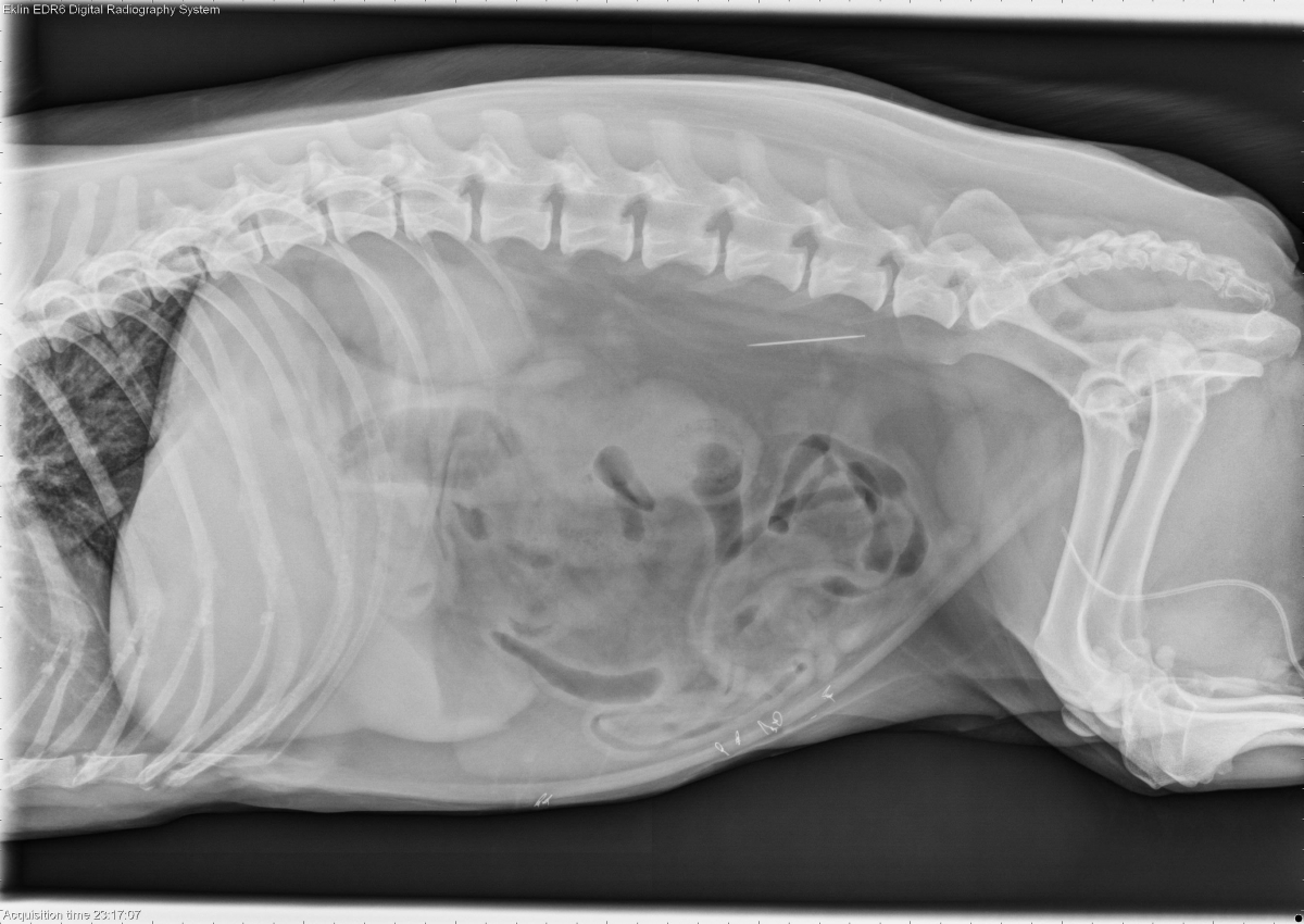 An ultrasound examination was performed to confirm the location of the foreign body. The duodenum was distended with fluid proximal to the clean-shadowing foreign object, and returned to normal diameter distal to it. A laparotomy was performed to remove both the foreign body and the sewing needle. The liver biopsy showed vacuolar hepatopathy.