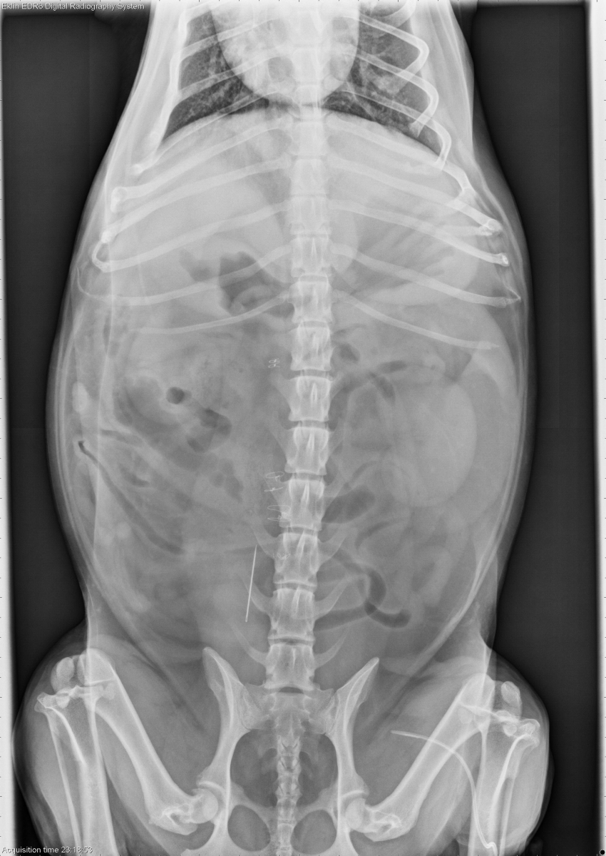 The liver is mildly enlarged with rounded margins. The stomach is mildly distended with fluid and gas. On the ventrodorsal projections, the duodenum is moderately distended with fluid and gas, with several unusual gas bubbles. There is a soft tissue-gas interface at the caudal duodenal flexure. The remainder of the small intestine is normal in diameter. A metallic sewing needle is present in the retroperitoneal space. No abnormalities are noted in the spleen or urinary tract. Radiopaque sutures are present in the ventral abdominal wall.